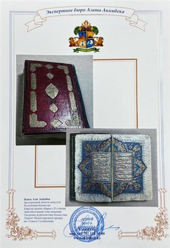 Разм. 27,0х17,0х6,0 см. Коран был переписан в 1217 г., что соответствует 1802 г.и подарен АЛИМ- ХАНУ, который правил Кокандским ханством с 1800 по 1809 годы. Позже Коран перешел по наследству одному из его преемников ХУДАЯР-ХАНУ,возведенному на трон в 13 лет кыпчаками из рода «мангыт», которые считались потомками Чингис - хана. Худаяр - хан правил с 1845 по 1876 годы. Он четырежды терял трон и четыре раза восстанавливал свою власть, став самым влиятельным и могущественным правителем Кокандского ханства.