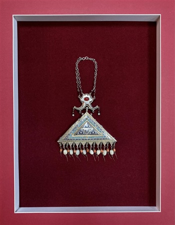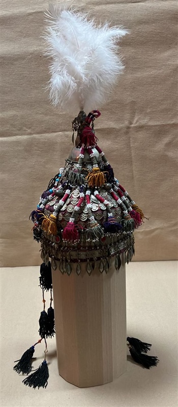 Казахский женский головной убор. Плотная ткань, шитье. Декорировка серебряными круглыми пластинами, цветным бисером и шелковыми цветными нитями. Куполообразное навершие из серебра. Казахстан. XIX в. №395