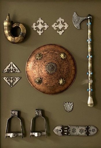 1. Калкан - боевой щит 2. Айбалта - боевой топор 3 . Окшантай - пороховницы 4. Узенги - стремена 5. Детали токыма - кожаного чепрака от конского снаряжения. Казахстан. XVIII- XIX вв. № 405